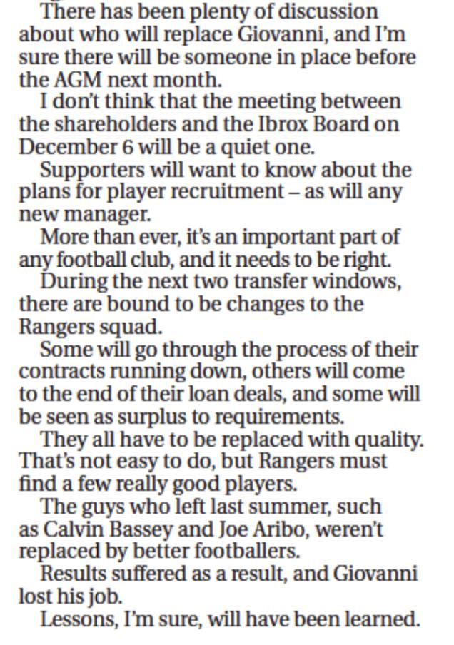 While writing his column for the Sunday Post (27 November, page 16 of Sports section), the legendary Scottish striker says that supporters will demand answers from the shareholders and the Rangers board about their plans for player recruitment.