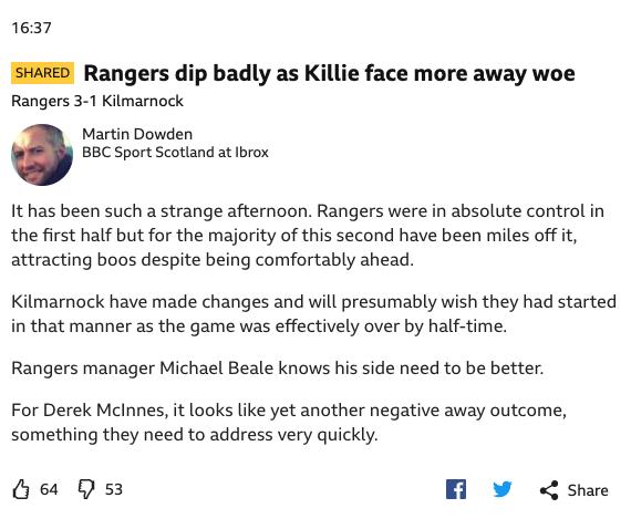 Dowden said via the BBC Sport live-blog update at 4.37pm: “It has been such a strange afternoon. Rangers were in absolute control in the first half but for the majority of this second have been miles off it, attracting boos despite being comfortably ahead.