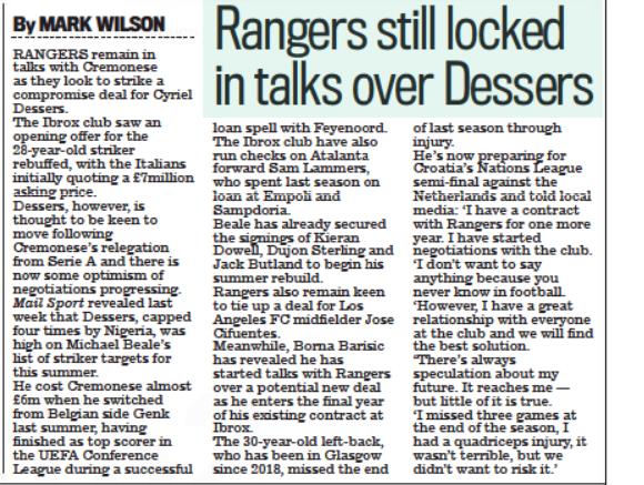 Dessers is understood to be high on Michael Beale’s wishlist at Ibrox and it’s evident that the manager wants to sign him.