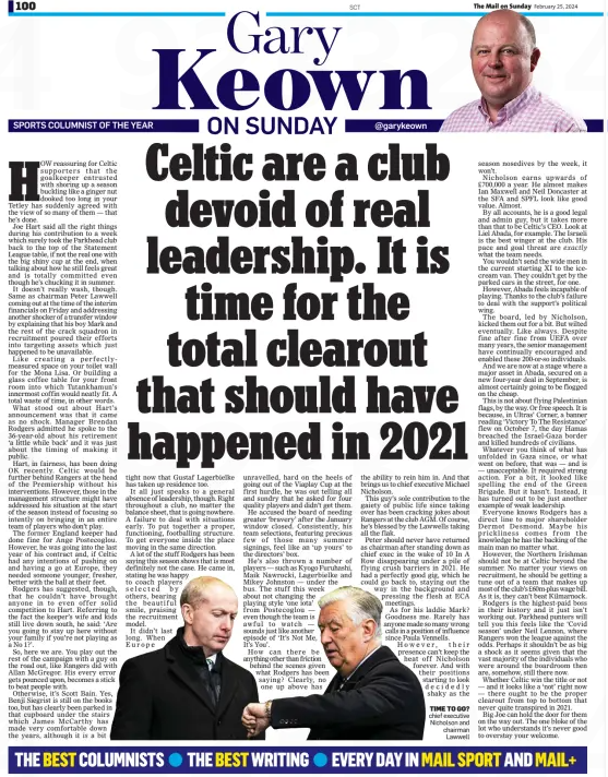 “Celtic would be further behind Rangers at the head of the Premiership without his interventions,” said Keown. “However, those in the management structure might have addressed his situation at the start of the season instead of focusing so intently on bringing in an entire team of players who don’t play.