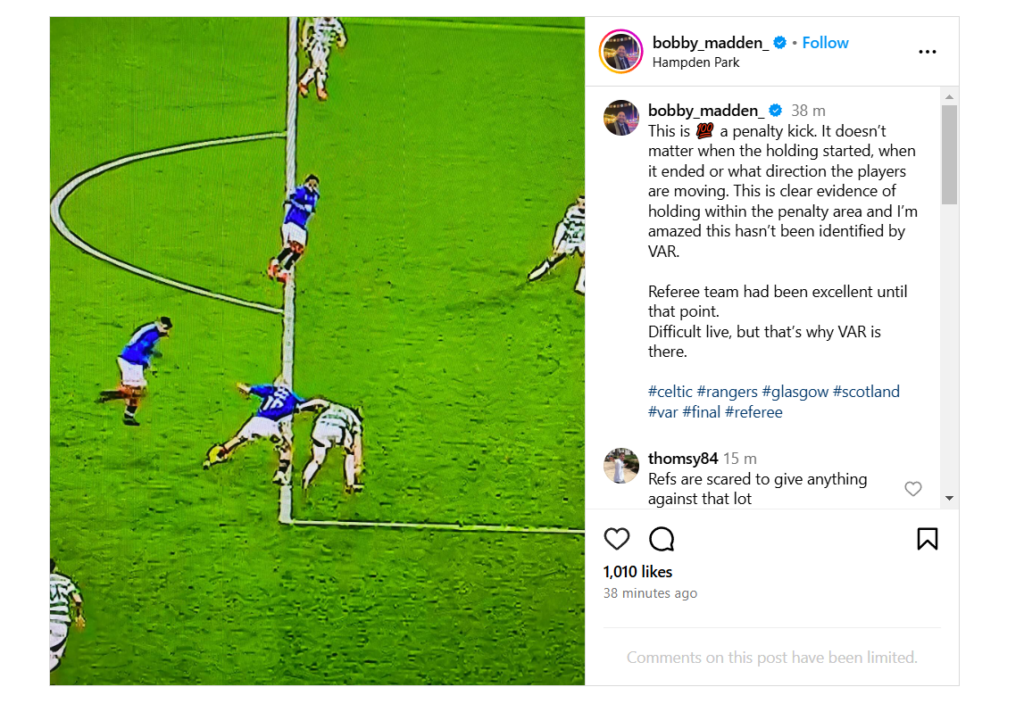 Madden wrote on Instagram on 15 December: “This is a penalty kick. It doesn’t matter when the holding started, when it ended or what direction the players are moving. This is clear evidence of holding within the penalty area and I’m amazed this hasn’t been identified by VAR.