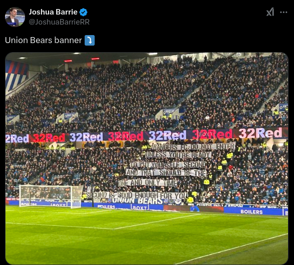 The Union Bears held up a banner expressing that second place is not acceptable for Rangers during their game against Aberdeen, Joshua Barrie shared via social media.