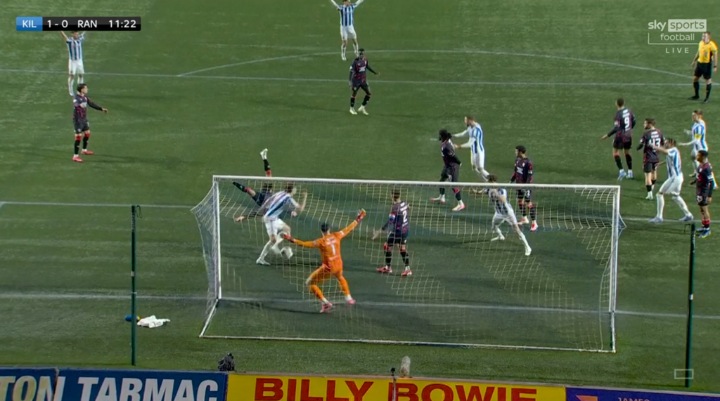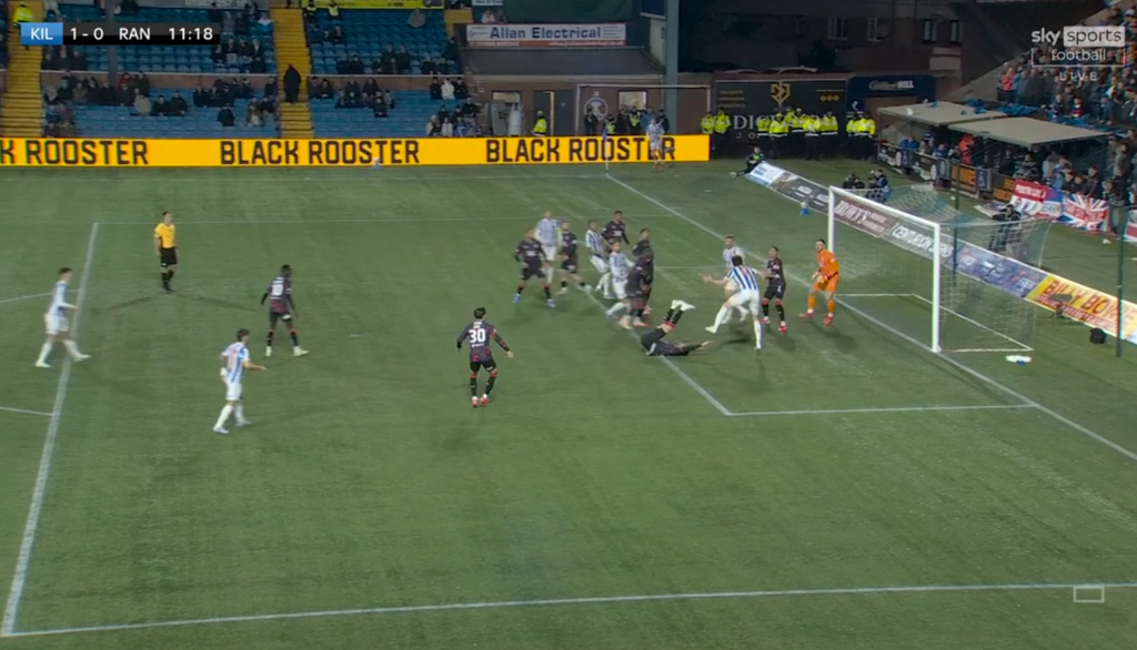 Robin Propper was flattened as Kilmarnock took the lead against Rangers at Rugby Park on Wednesday night.