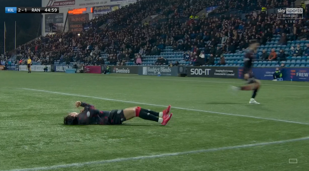 Hagi rolled around in the Kilmarnock box several times after trying to win a penalty towards the end of the first half at Rugby Park.