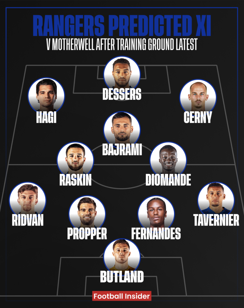 Rangers: Butland, Tavernier, Fernandes, Propper, Yilmaz, Diomande, Raskin, Cerny, Bajrami, Hagi, Dessers.