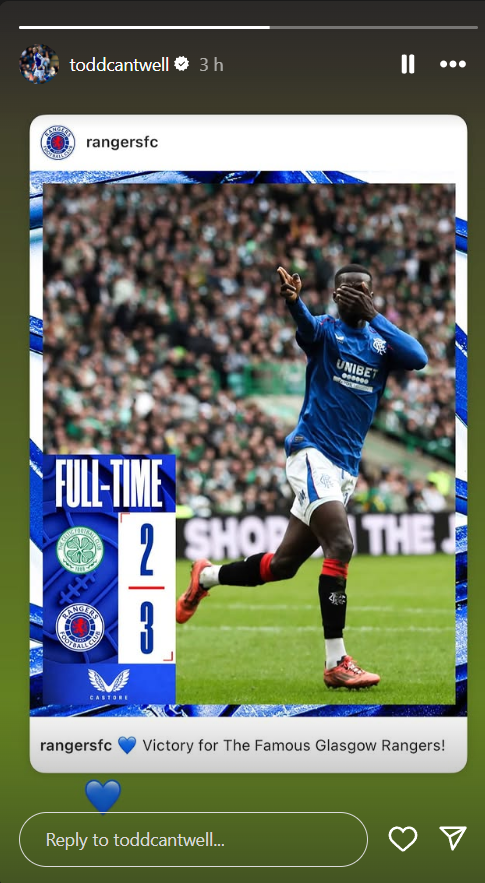 Todd Cantwell posted on Instagram as Rangers secured the three points against Celtic at Parkhead on Sunday.