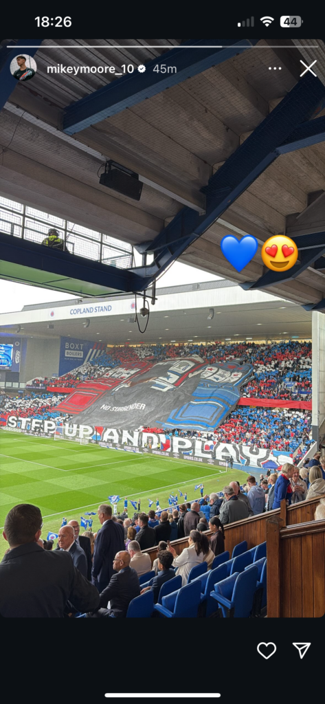 The Gers faithful unveiled a “No Surrender” tifo before the clash, and Moore was quick to snap a photo and approve it via his personal Instagram account.
