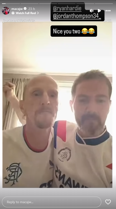 With all that going on, McClean has taken to Instagram to reshare a video of two Rangers fans, mocking both Ryan Hardie and Jordan Thompson in the process.