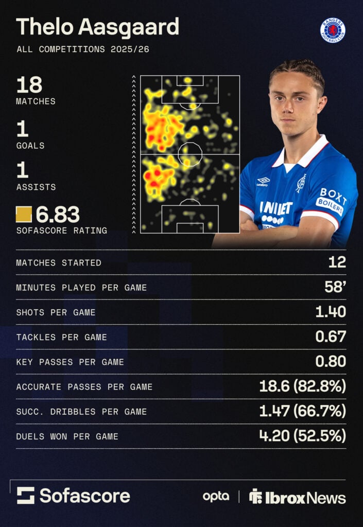 However, Aasgaard’s only Rangers goal came against Dundee United, where he sublimely curled a finish past goalkeeper Yevhenii Kucherenko after a dazzling run.